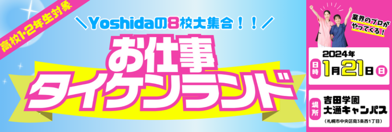 2024年1月21日(日)に ★吉田学園の8つの専門学校が大集合!! ✨お仕事タイケンランド✨ in 札幌大通★ を開催します! 道内最大級のイベントで自分に合った「お仕事」を発見しよう!🙌 … 続きを読む 1/21(日)『お仕事タイケンランド』~公務員編~